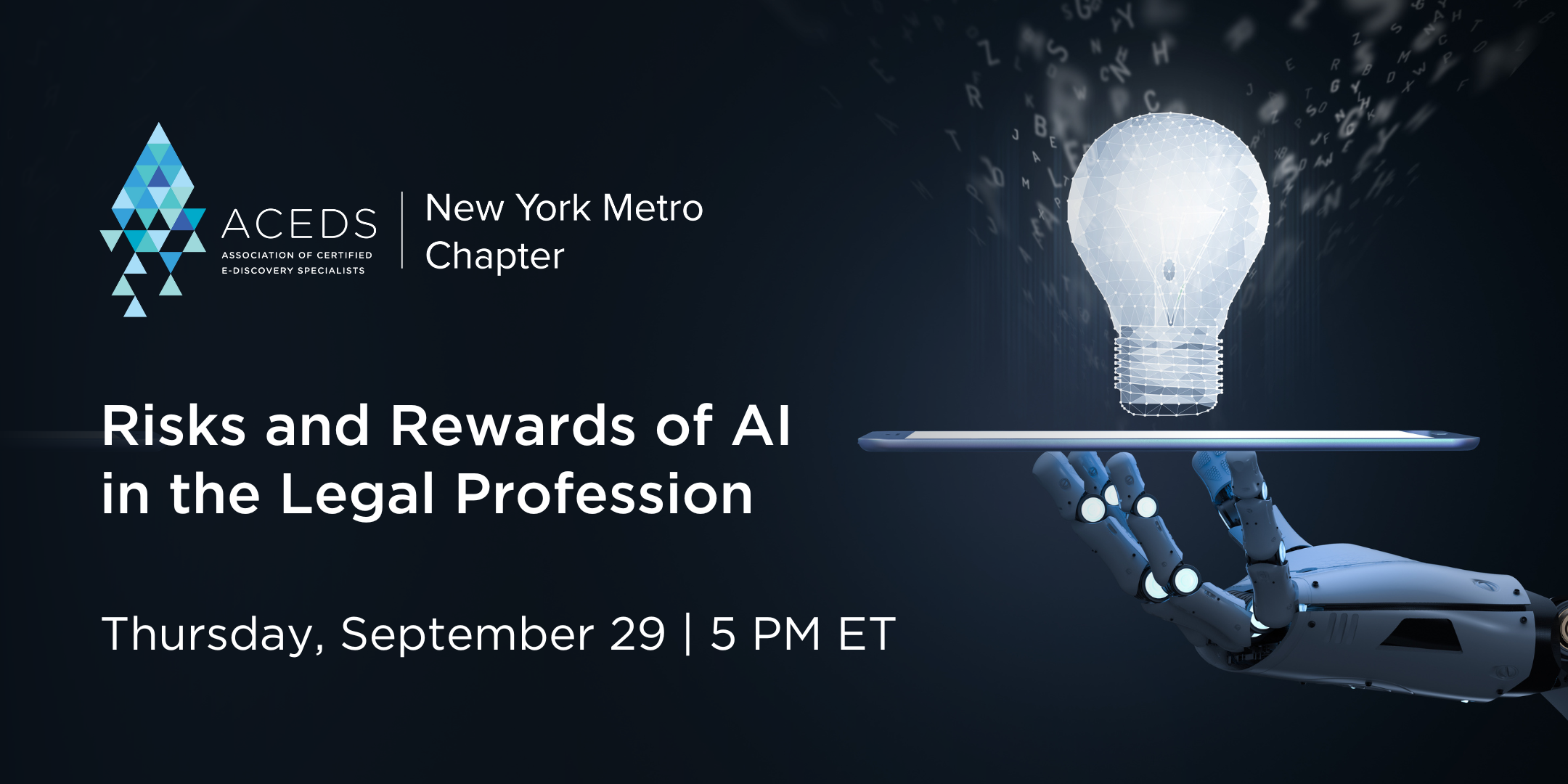 Join the ACEDS NY Metro Chapter for a webinar.Should we bow to our robot overlords or use them to our advantage? Join ACEDS NY for an intriguing panel discussion on the risks, rewards, and hidden issues related to AI in the legal profession. Our panel gathers some of the foremost experts on this topic including:James […]